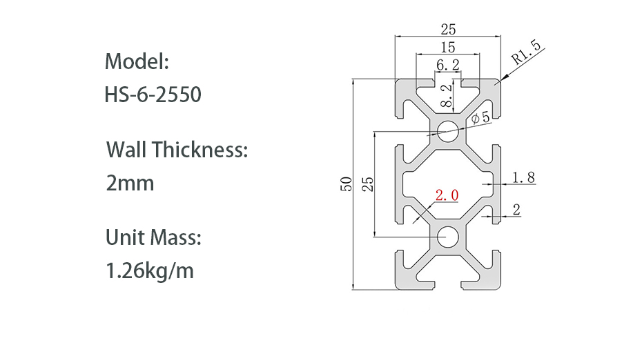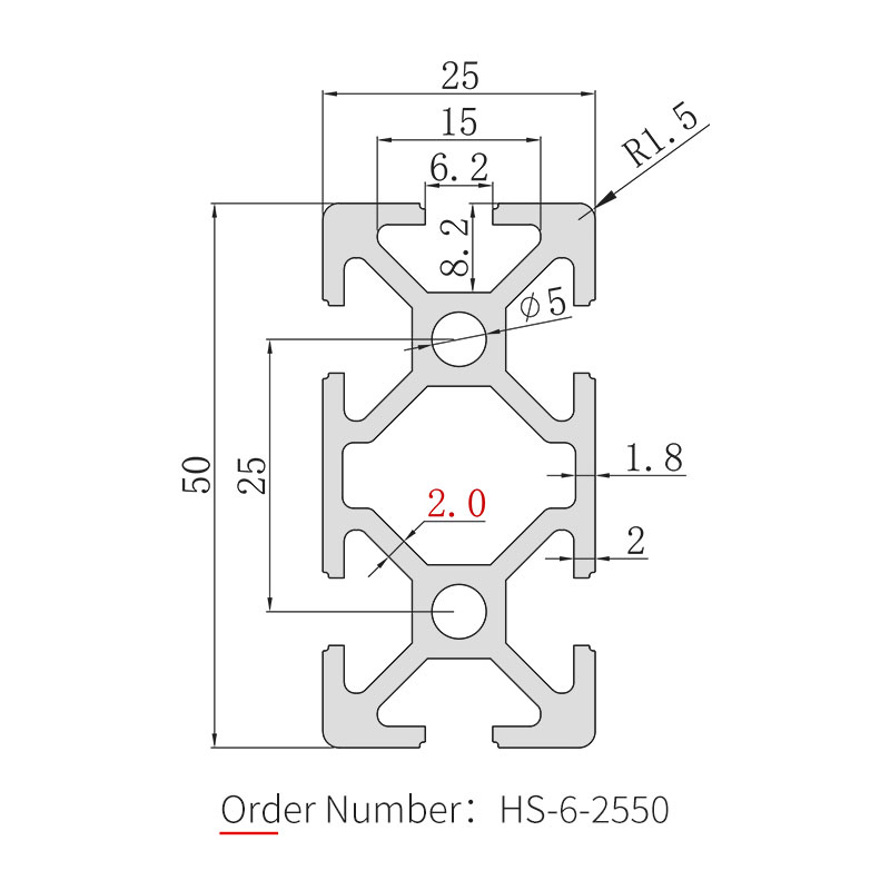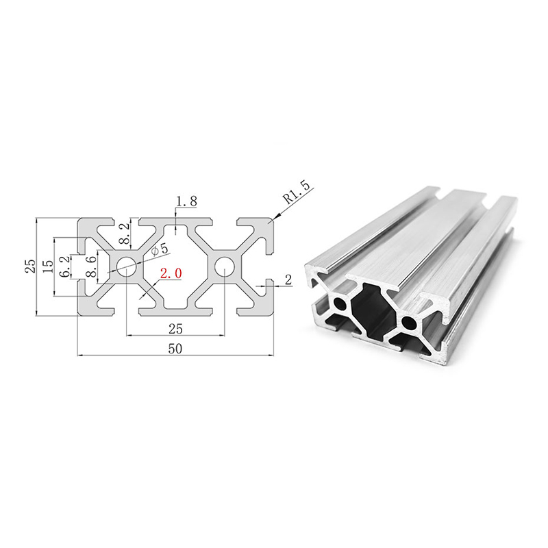 El perfil de aluminio 2550 es el modelo de sección transversal rectangular de la serie 25, con dimensiones de 25×50 mm y un ancho de ranura disponible de 6 mm. El cuerpo está fabricado en aleación de aluminio 6063-T5 con tratamiento superficial anodizado, ofreciendo un acabado plateado brillante con fuerte resistencia a la corrosión. Se utiliza comúnmente para marcos de líneas de ensamblaje automatizadas, bases de equipos de tamaño mediano, soportes de bancos de trabajo, barreras protectoras mecánicas y soportes de líneas transportadoras, lo que lo convierte en una opción ideal en la serie 25 que equilibra la rigidez y el diseño liviano.